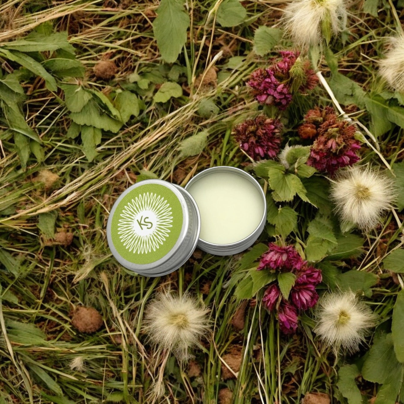 Containing cocoa butter and shea butter to soften, with essential oils.